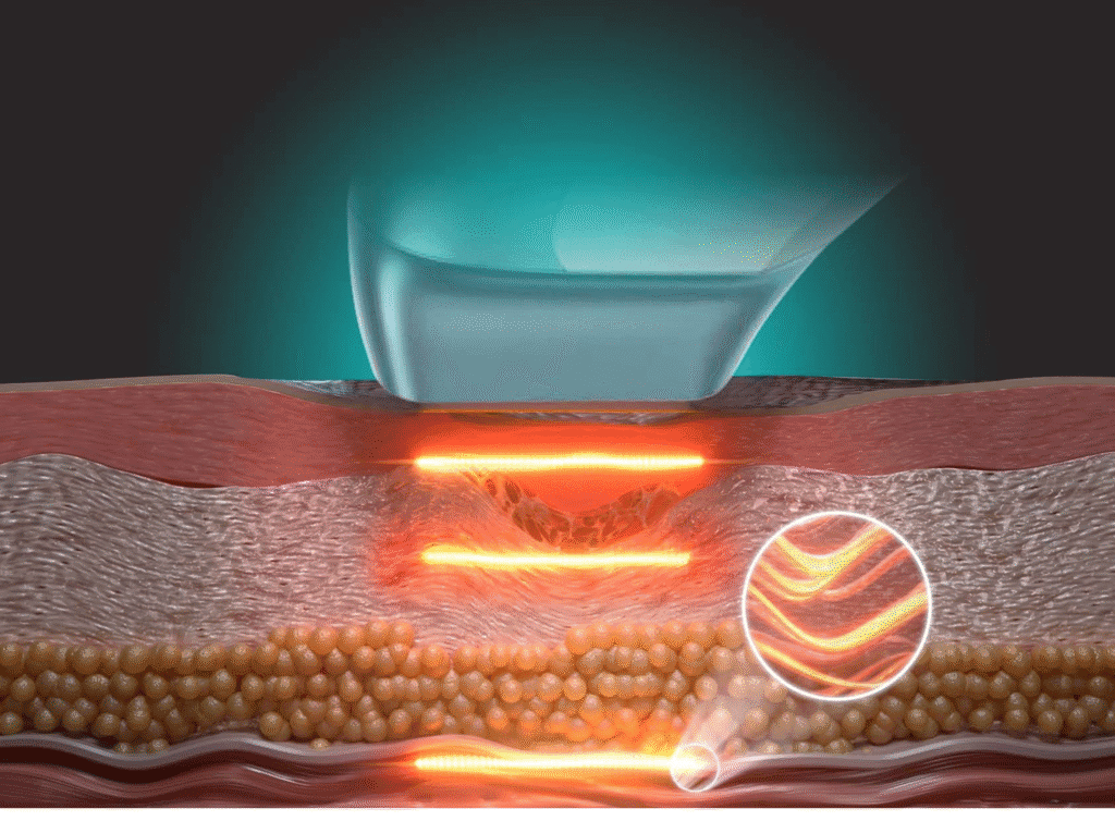 The Sonilift MFU enhances natural collagen regeneration by penetrating deeply into the skin’s layers (epidermis, dermis, SMAS, and fat) with concentrated ultrasonic radiation.
